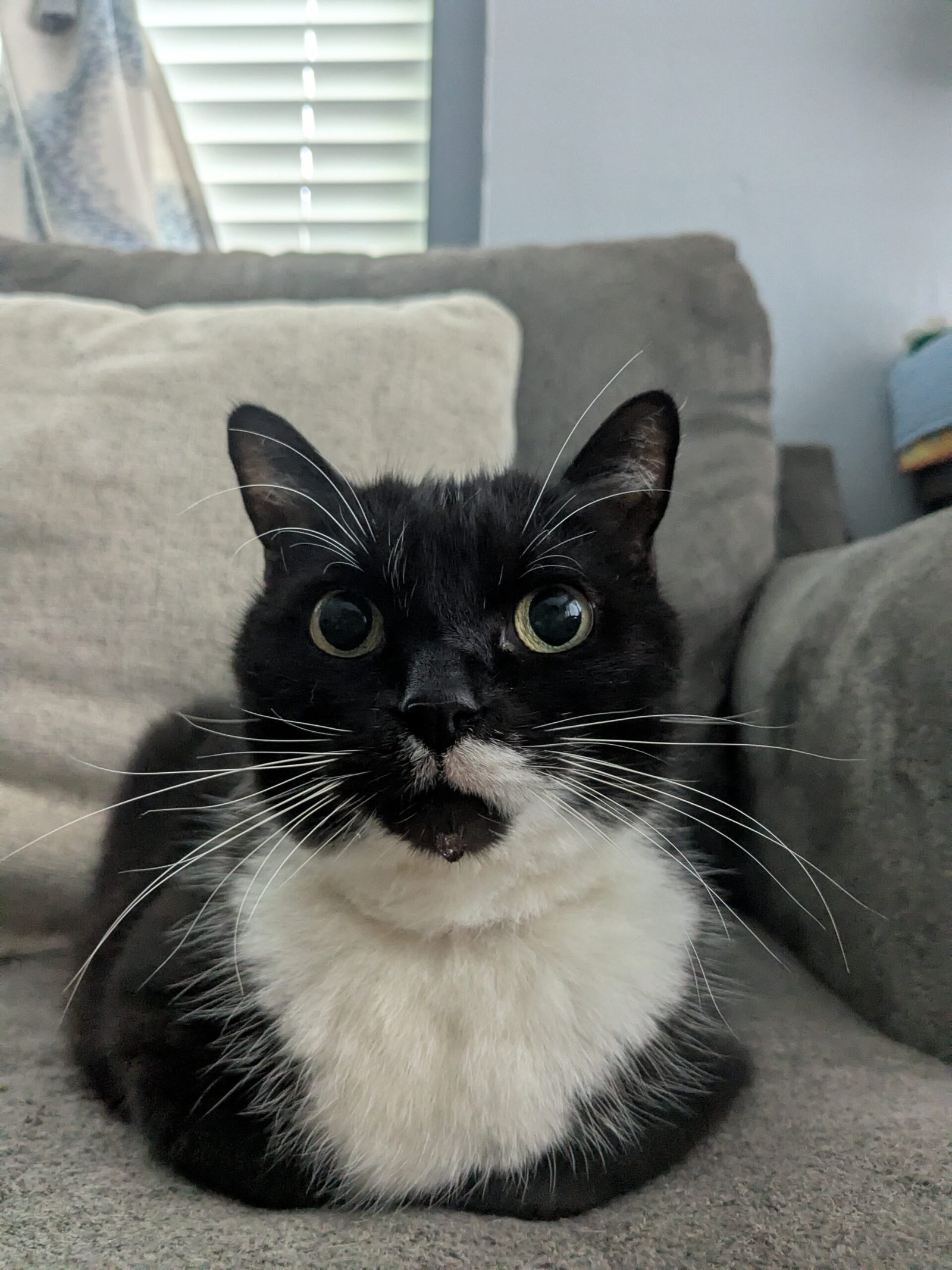 Peppercini is a 5-year-old tabby that is super sweet and playful. She makes the most appearances and isn’t shy about coming on screen and demanding attention.